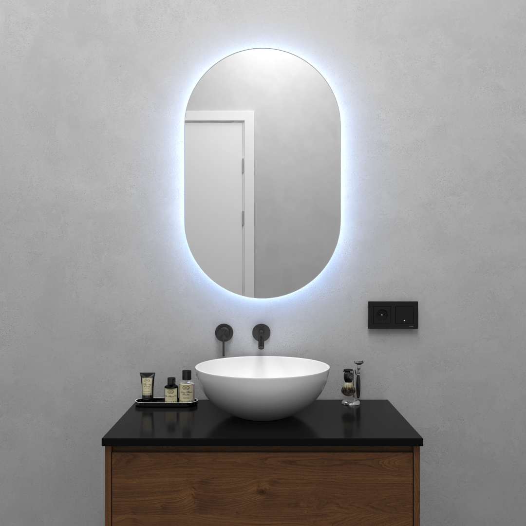 Безрамное зеркало овальной (капсульной) формы с контурной (тыльной) холодной подсветкой, свет 6000К. Подложка из высококачественного МДФ, светодиодная лента защищена матовым свето-рассеивателем от попадания пыли и влаги. Есть вывод 220W для подключения к сети, включение подсветки от выключателя на стене, либо от розетки.
